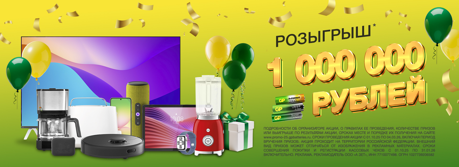*Подробности об организаторе Акции, о правилах ее проведения, количестве призов или выигрыше по результатам Акции, сроках, месте и порядке их получения на сайте promo-25.gpbatteries.ru. Сроки проведения акции с 01.10.25 по 04.03.26, включая период вручения призов. Сроки совершения покупки и регистрации кассовых чеков с 01.10.25 по 31.01.26 включительно.
