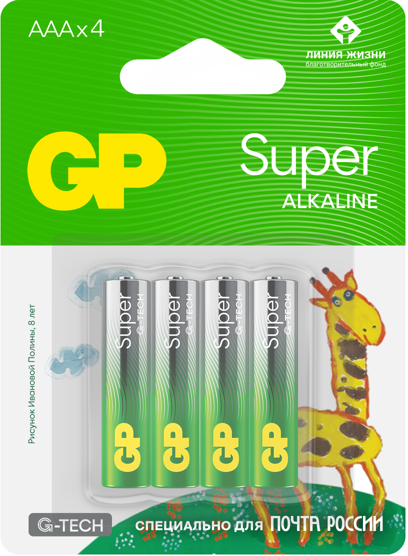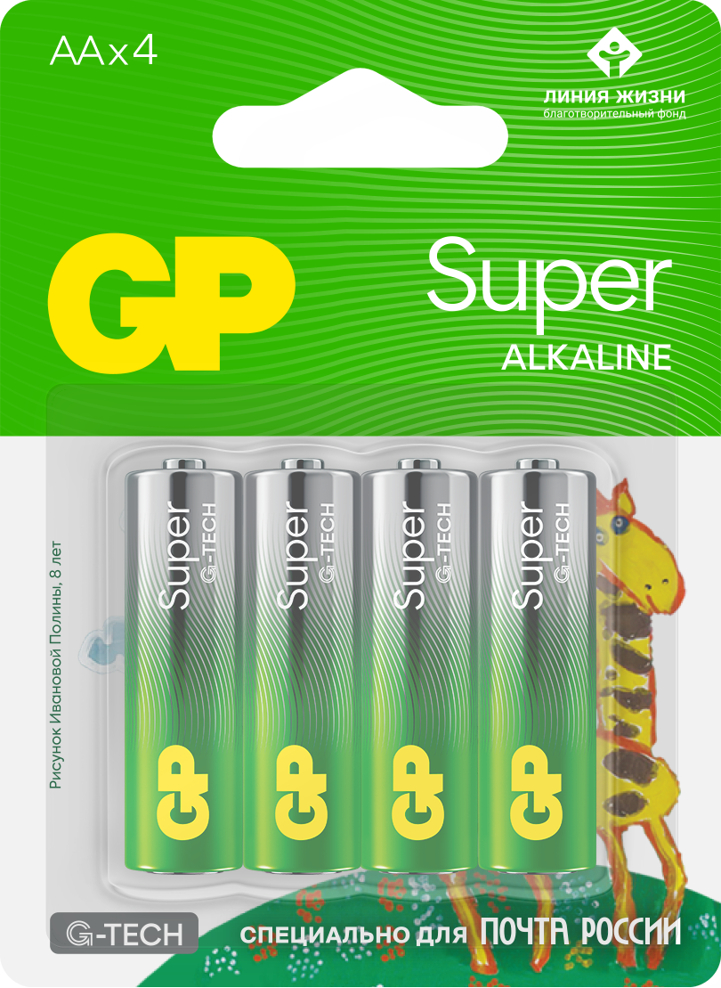 В акции участвуют батарейки GP Super типоразмеров АА и ААА по 4 штуки в упаковке с детским рисунком Полины Ивановой «Жираф».